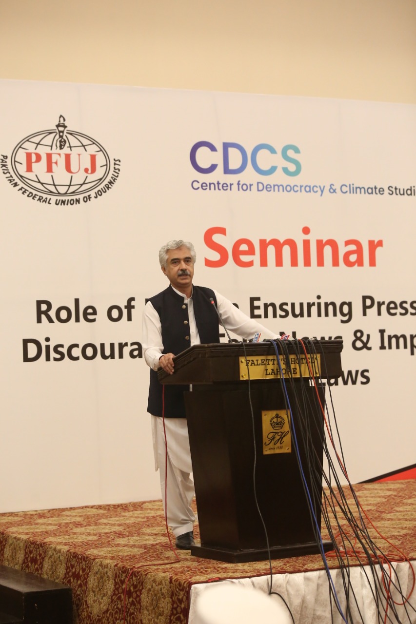 Moderated by prominent anchorperson Fareed Rais, the seminar was addressed by Punjab Senior Minister Mian Aslam Iqbal, Advisor to Punjab Chief Minister Omar Sarfaraz Cheema, Jamat-e-Islami Secretary General Liaquat Baloch, Shehzad Cheema of Pakistan Peoples Party, Lahore Press Club President Azam Rana, Executive Editor of Dunya News Salman Ghani, Anchorperson Habib Akram and other renowned figures.