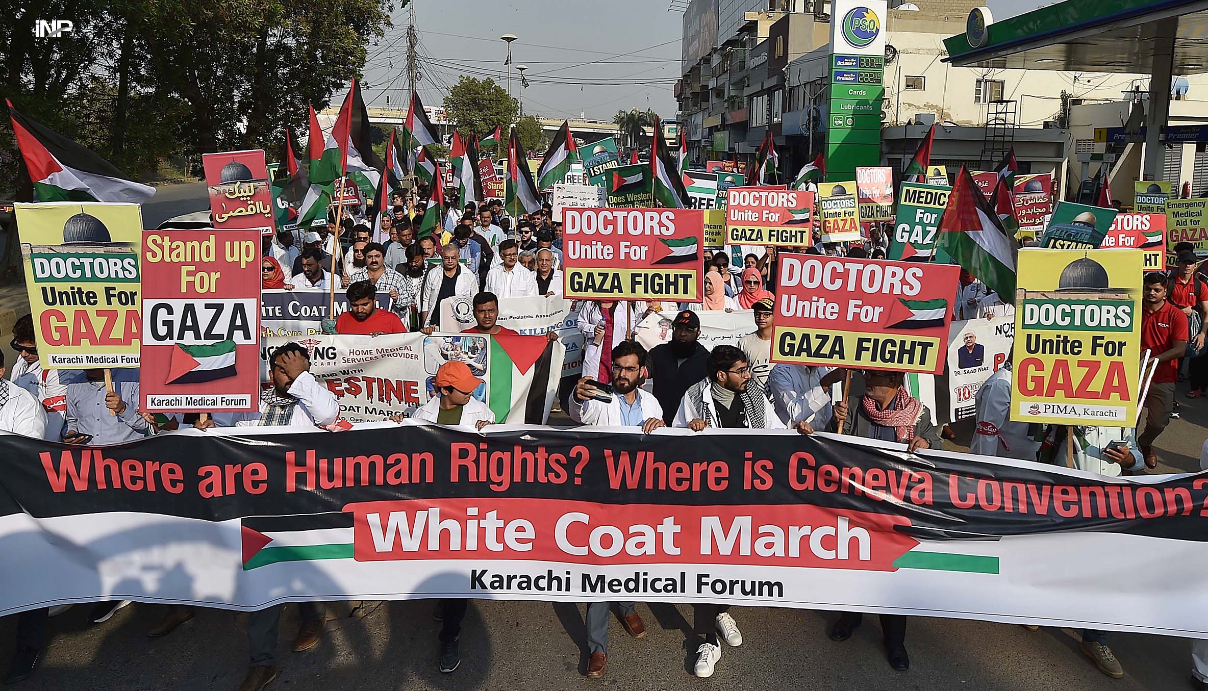 KARACHI: Hundreds of doctors and paramedics marched in commercial capital Karachi on Sunday to pay tribute to their Palestinian counterparts who have been performing their duties despite intensified Israeli airstrikes and bombings of hospitals in Gaza.