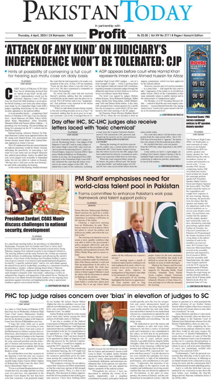 E-papers April 4, 2024 Epaper_24-04-4 KHI By E-Paper FacebookTwitterLinkedinWhatsAppEmail Previous articleDay after IHC, SC-LHC judges also receive letters laced with ‘toxic chemical’Next articleEpaper_24-04-4 ISB E-Paper RELATED ARTICLES E-papers Epaper_26-02-12 LHR E-papers Epaper_26-02-12 KHI E-papers Epaper_26-02-12 ISB E-papers Epaper_26-02-11 LHR E-papers Epaper_26-02-11 KHI E-papers Epaper_26-02-11 ISB Must Read Comment Pakistan’s Bull Market and the economy it doesn’t represent February 12, 2026 Another rally broke out on the Pakistan Stock Exchange last Friday. The KSE-100 index rose more than 1,800 points, rebound sharply to reach an... Solar at a crossroads February 12, 2026 KP cabinet approves cash support for over one million families during Ramzan February 12, 2026 Early counts suggest BNP races ahead Jamaat in Bangladesh election after strong turnout February 12, 2026