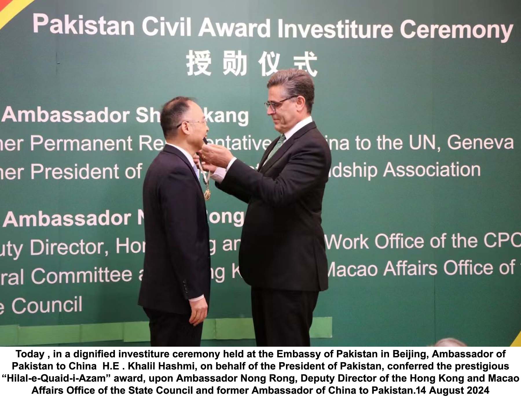 ISLAMABAD: In a dignified investiture ceremony held at Pakistan Embassy in Beijing, Ambassador Khalil Hashmi on Wednesday conferred the prestigious ‘Hilal-e-Quaid-i-Azam’ award, upon two distinguished Chinese dignitaries on behalf of the president of Pakistan.