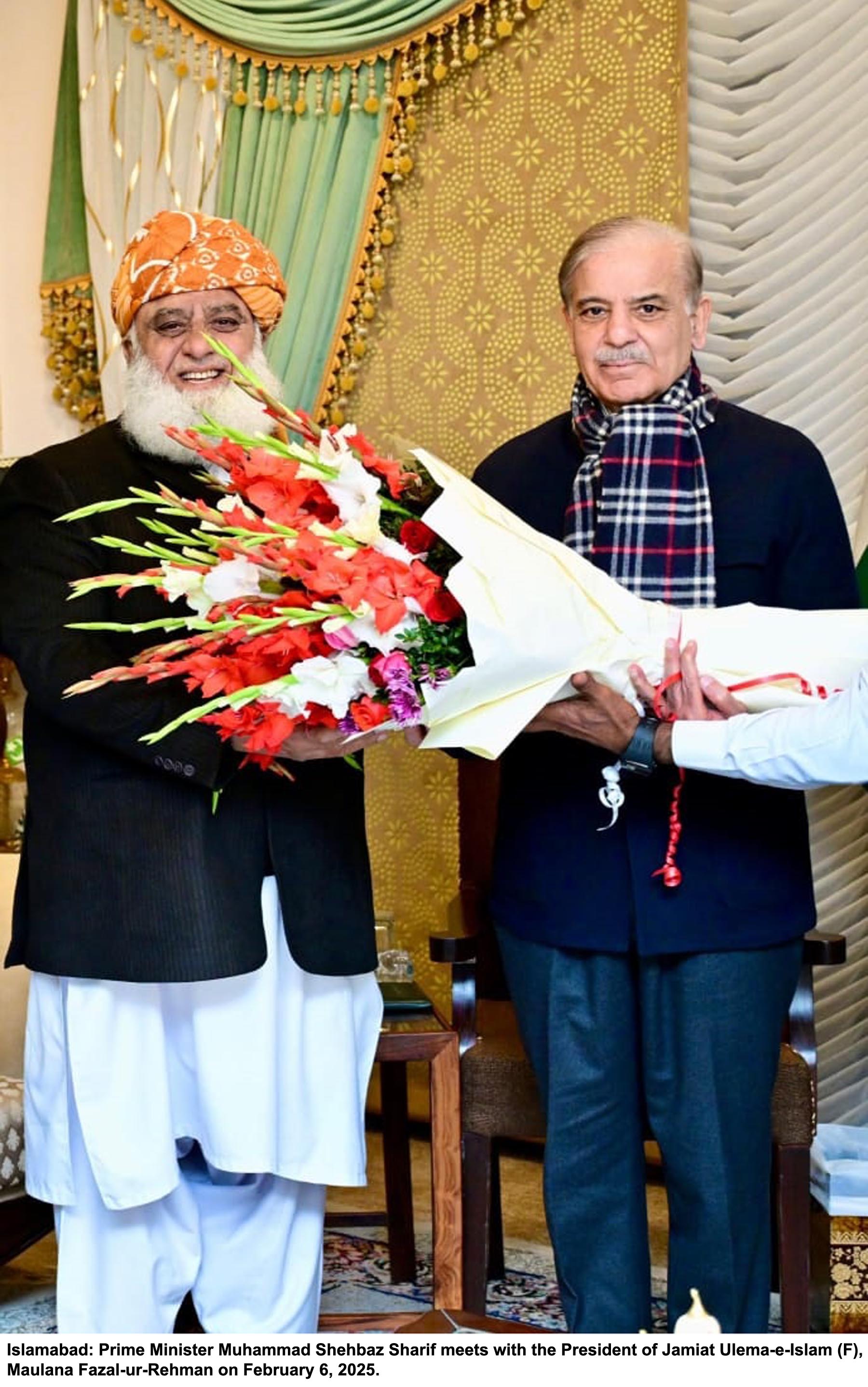 ISLAMABAD: Prime Minister Shehbaz Sharif visited the residence of Jamiat Ulema-e-Islam-Fazl (JUI-F) chief Maulana Fazlur Rehman and discussed with him the prevailing political situation in the country.