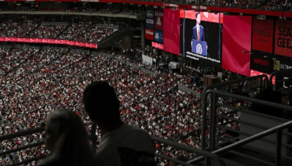 The arena, which normally has a capacity of 63,000, appeared full. Crowds of people, many wearing MAGA attire, arrived before dawn to secure seats inside the stadium, where they encountered metal detectors amid tight security.