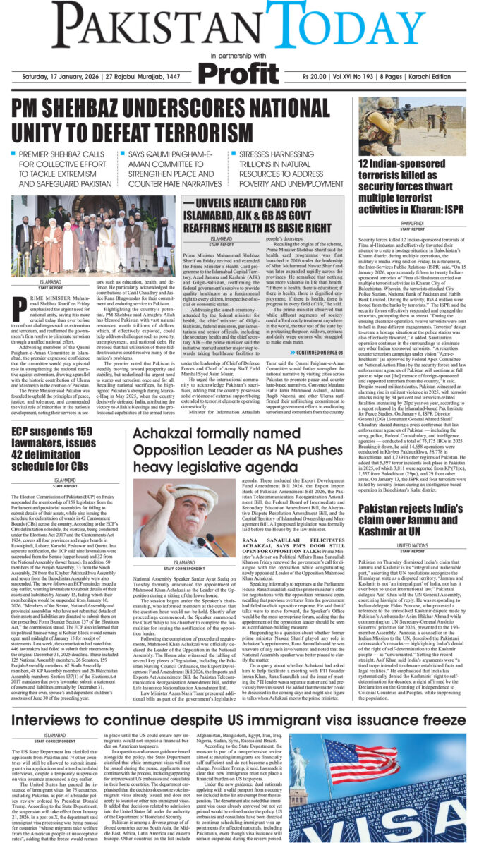 E-papers January 17, 2026 Epaper_26-1-17 KHI By Imran Nisar FacebookTwitterLinkedinWhatsAppEmail Previous articleCM Afridi questions ‘effectiveness’ of military operations in KPNext articleEpaper_26-1-17 ISB Imran Nisar LEAVE A REPLY Cancel reply Comment: Please enter your comment! Name: Please enter your name here Email: You have entered an incorrect email address! Please enter your email address here Website: Save my name, email, and website in this browser for the next time I comment. RELATED ARTICLES E-papers Epaper_26-1-17 LHR E-papers Epaper_26-1-17 ISB E-papers Epaper_26-01-16 LHR E-papers Epaper_26-01-16 KHI E-papers Epaper_26-01-16 ISB E-papers Epaper_26-1-15 LHR Must Read NATIONAL PTI leaders open, but Imran Khan blocks dialogue: Sanaullah January 17, 2026 Adviser to PM says dialogue and a meeting with jailed leader possible only after Feb 8 protest Says govt preparing to deal with... PM Shehbaz underscores national unity to defeat terrorism January 16, 2026 PM unveils health card for Islamabad, AJK & GB as govt reaffirms health as basic right January 16, 2026 12 Indian-sponsored terrorists killed as security forces thwart multiple terror activities in Kharan: ISPR January 16, 2026