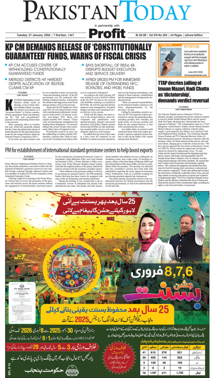 E-papers January 28, 2026 Epaper_26-01-27 LHR By Imran Nisar FacebookTwitterLinkedinWhatsAppEmail Previous articleEpaper_26-01-27 ISBNext articleEpaper_26-1-28 KHI Imran Nisar LEAVE A REPLY Cancel reply Comment: Please enter your comment! Name: Please enter your name here Email: You have entered an incorrect email address! Please enter your email address here Website: Save my name, email, and website in this browser for the next time I comment. RELATED ARTICLES E-papers Epaper_26-1-28 LHR E-papers Epaper_26-1-28 ISB E-papers Epaper_26-1-28 KHI E-papers Epaper_26-01-27 ISB E-papers Epaper_26-01-27 KHI E-papers Epaper_26-01-26 LHR Must Read E-papers Epaper_26-01-27 KHI January 28, 2026 President Zardari meets UAE counterpart, pledges to deepen bilateral strategic, economic ties January 28, 2026 Ahmed Baig to represent Pakistan on Asian Tour at Philippines Open January 28, 2026 Amir, Omer, Hamza advance in Millat Tractors Junior National Tennis Championship January 28, 2026