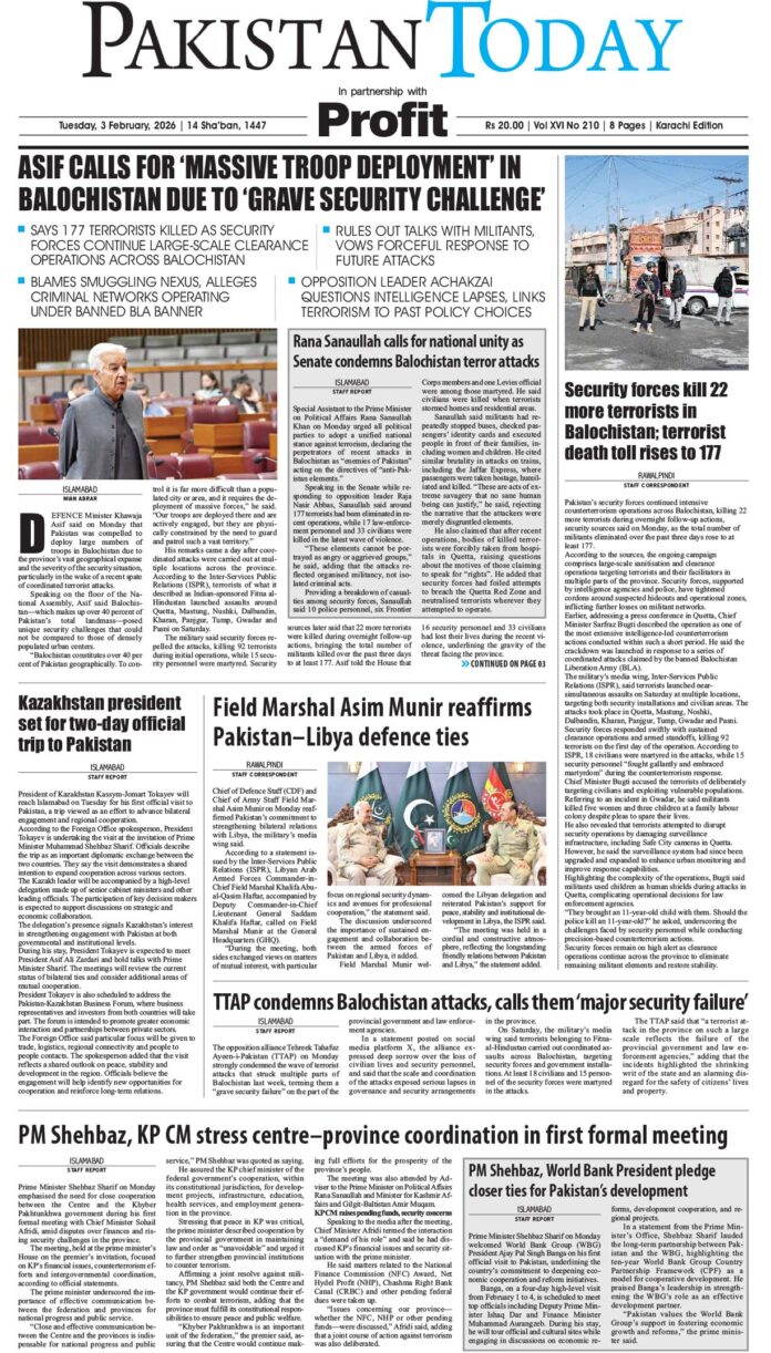 E-papers February 3, 2026 Epaper_26-02-3 KHI By Ahmed Salah-ud-din FacebookTwitterLinkedinWhatsAppEmail Previous articleEpaper_26-02-3 ISBNext articleEpaper_26-02-3 LHR Ahmed Salah-ud-din LEAVE A REPLY Cancel reply Comment: Please enter your comment! Name: Please enter your name here Email: You have entered an incorrect email address! Please enter your email address here Website: Save my name, email, and website in this browser for the next time I comment. RELATED ARTICLES E-papers Epaper_26-02-3 LHR E-papers Epaper_26-02-3 ISB E-papers Epaper_26-2-2 LHR E-papers Epaper_26-2-2 ISB E-papers Epaper_26-2-2 KHI E-papers Epaper_26-02-1 LHR Must Read Comment Addressing groundwater contamination and smog February 3, 2026 Pakistan, despite contributing very little to global emissions, is counted as among the most climate-vulnerable countries impacted by climate change. Earth protects us, and... Waiting for them to blink first February 3, 2026 IMCTC Secretary General meets COAS, pledges stronger counterterror cooperation February 3, 2026 Patriotism through knowledge February 2, 2026
