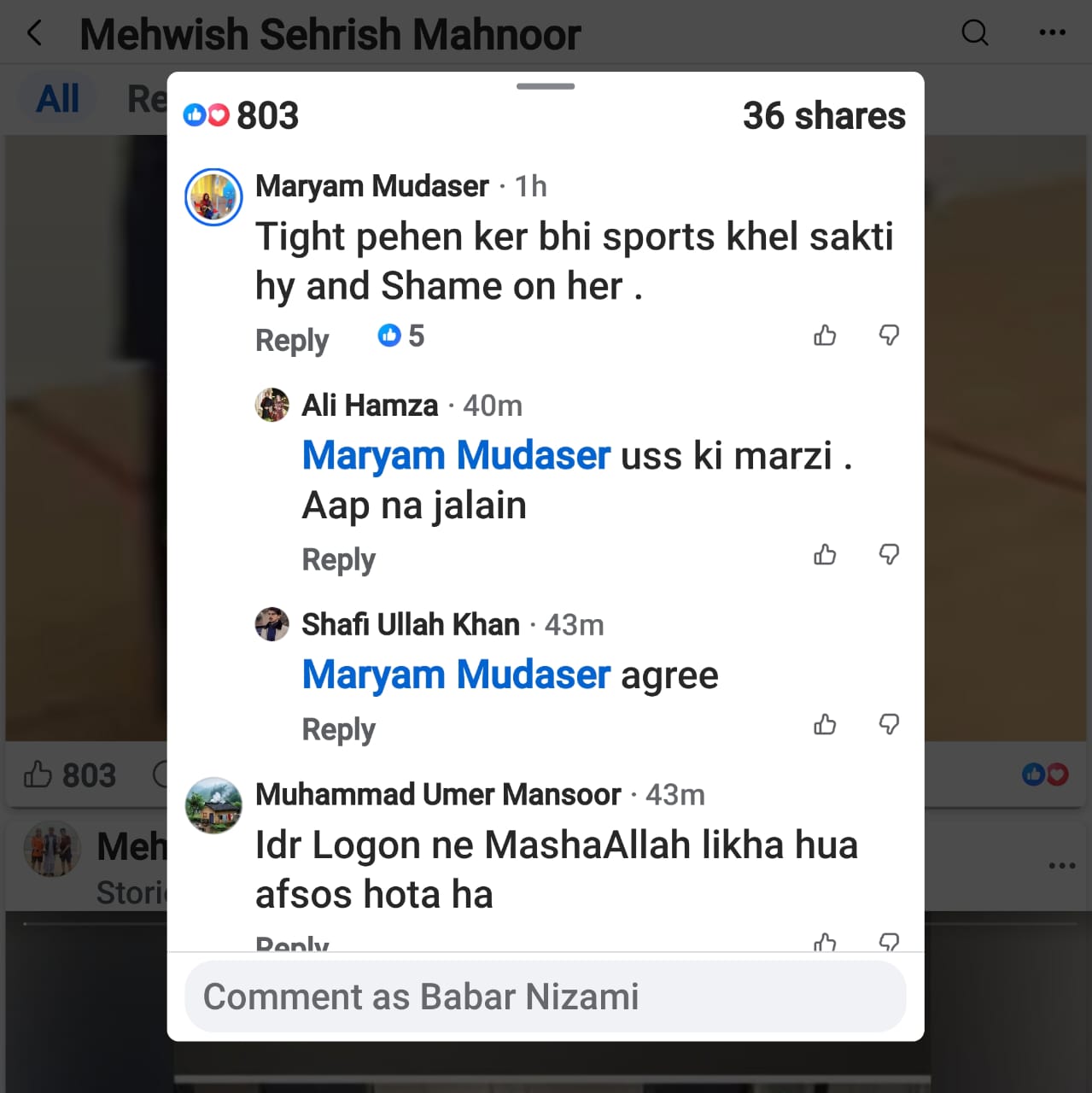 The online discussion includes remarks questioning whether women should participate in sports while wearing such attire. Other users responded by defending the athletes and urging critics not to focus on clothing.